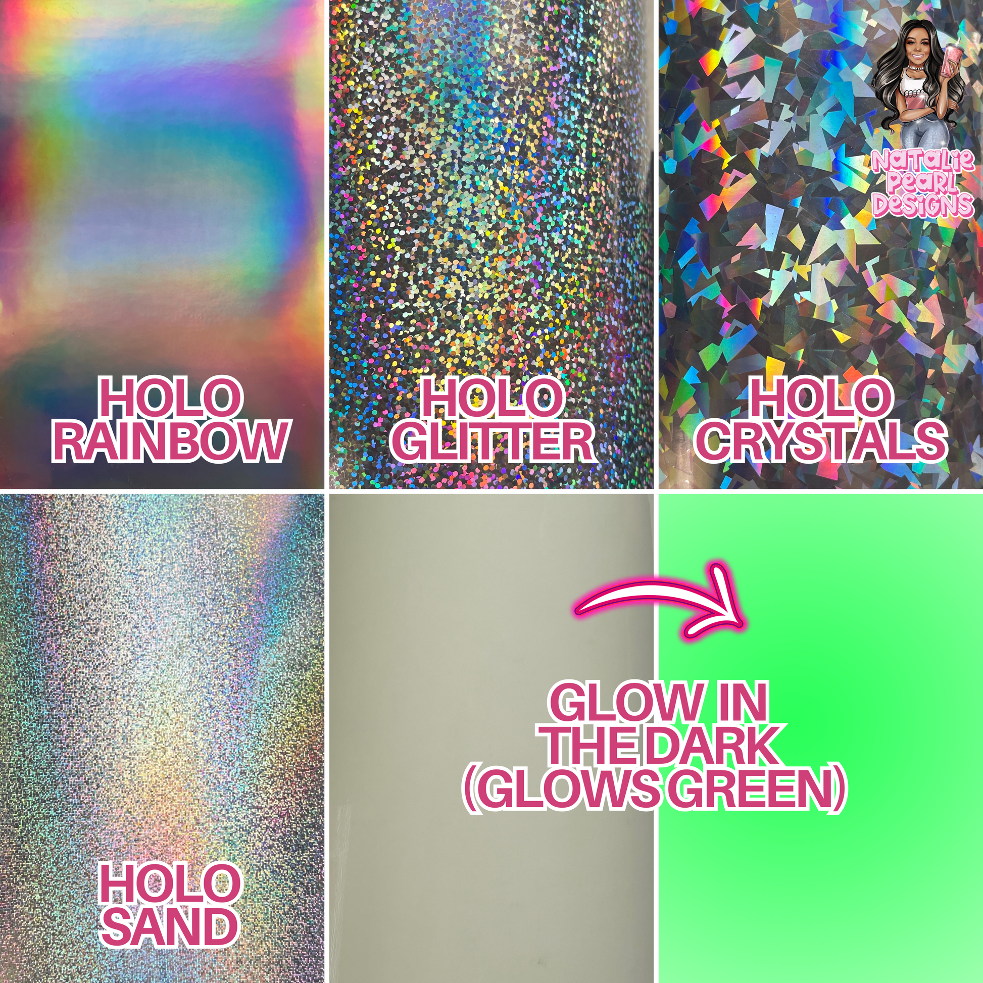 Printed on opaque white gloss or transparent(Clear See Through) ,Opaque Matte White Holographic Glitter, Holographic Rainbow, Holographic Crystals, Holographic Sand and Glow in the Dark permanent adhesive vinyl